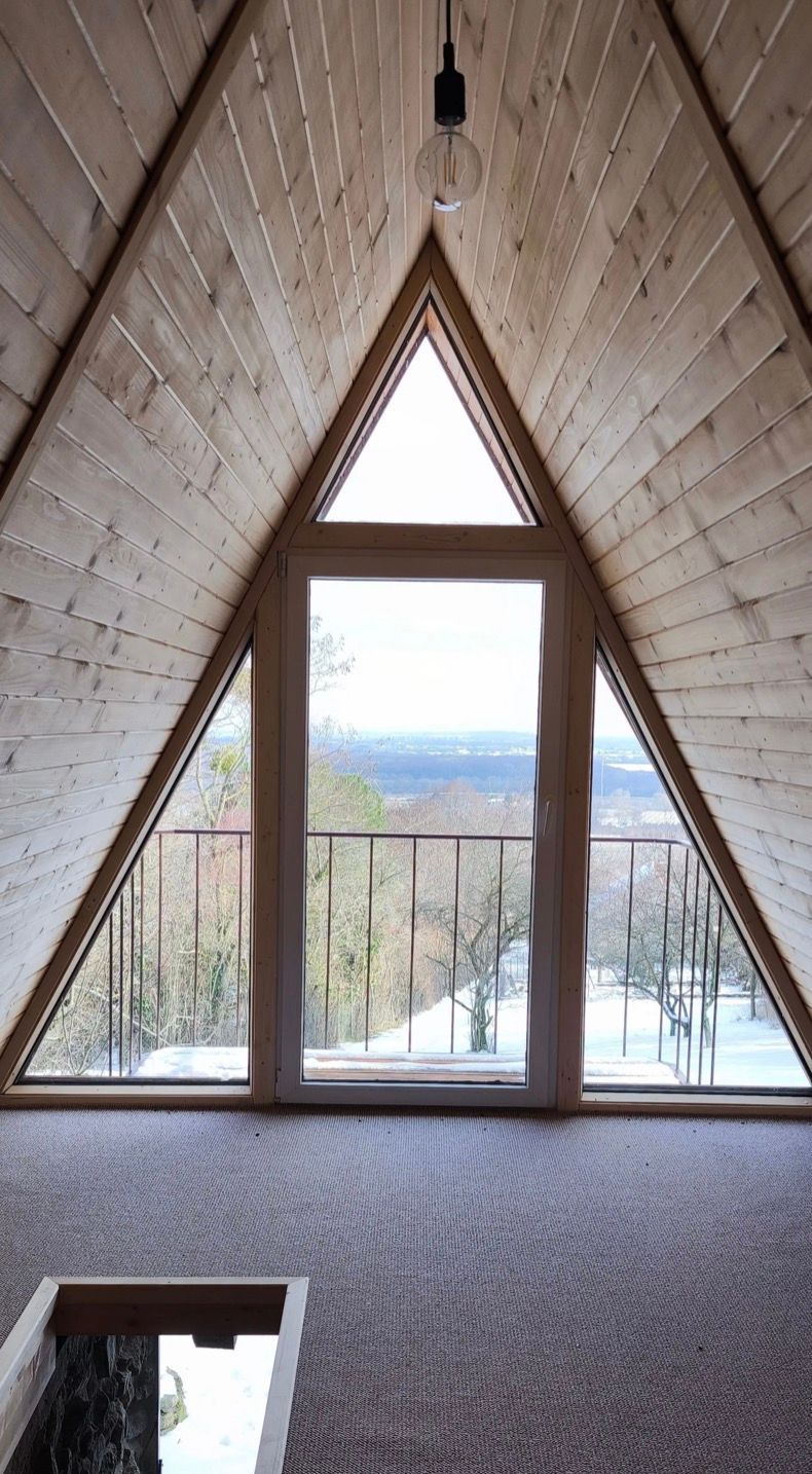 Vrchná časť: Citlivo zrekonštruovaná pôvodná strecha v tvare písmena „A. Dominuje jej veľkorysé presklenie, ktoré do interiéru vnáša dostatok svetla a prepája vás s okolitou prírodou.