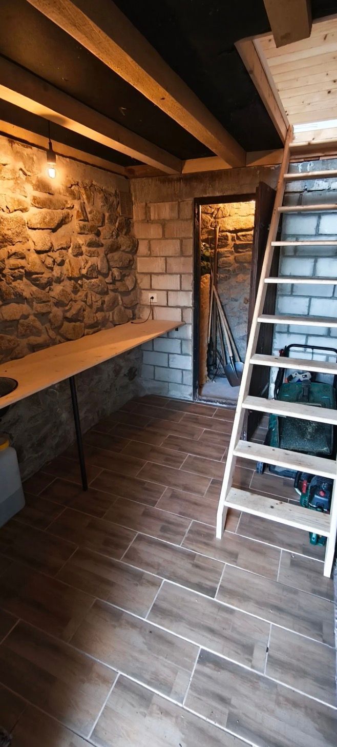 Spodná časť: Pôvodný vinohradnícky domček, vymurovaný základ z prírodného kameňa, ktorý zabezpečuje príjemnú klímu v lete a stabilitu stavby.