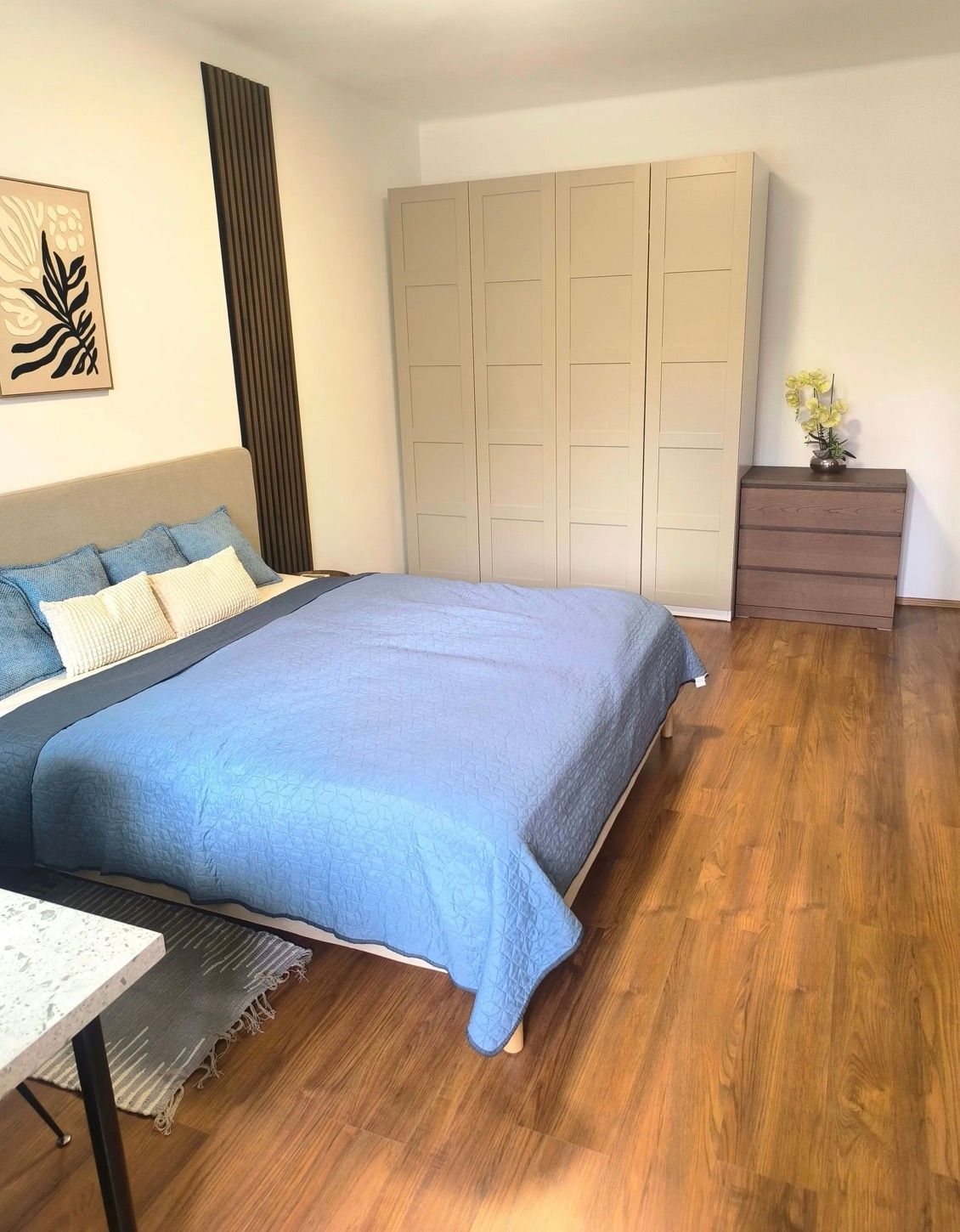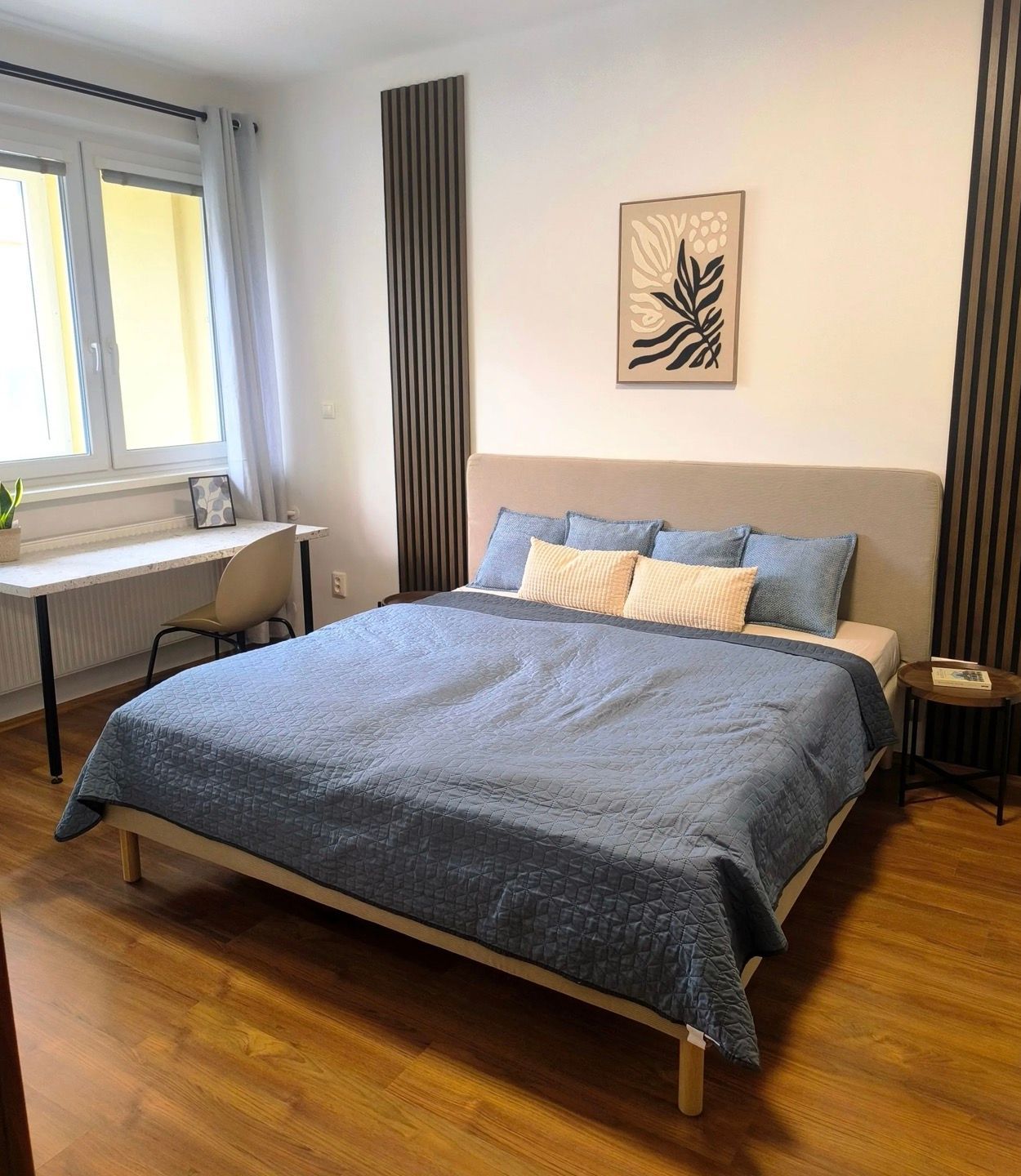 Samostatná spálňa ponúka úložné priestory, veľkú posteľ a miesto so stolom na pohodlnú prácu z domu.