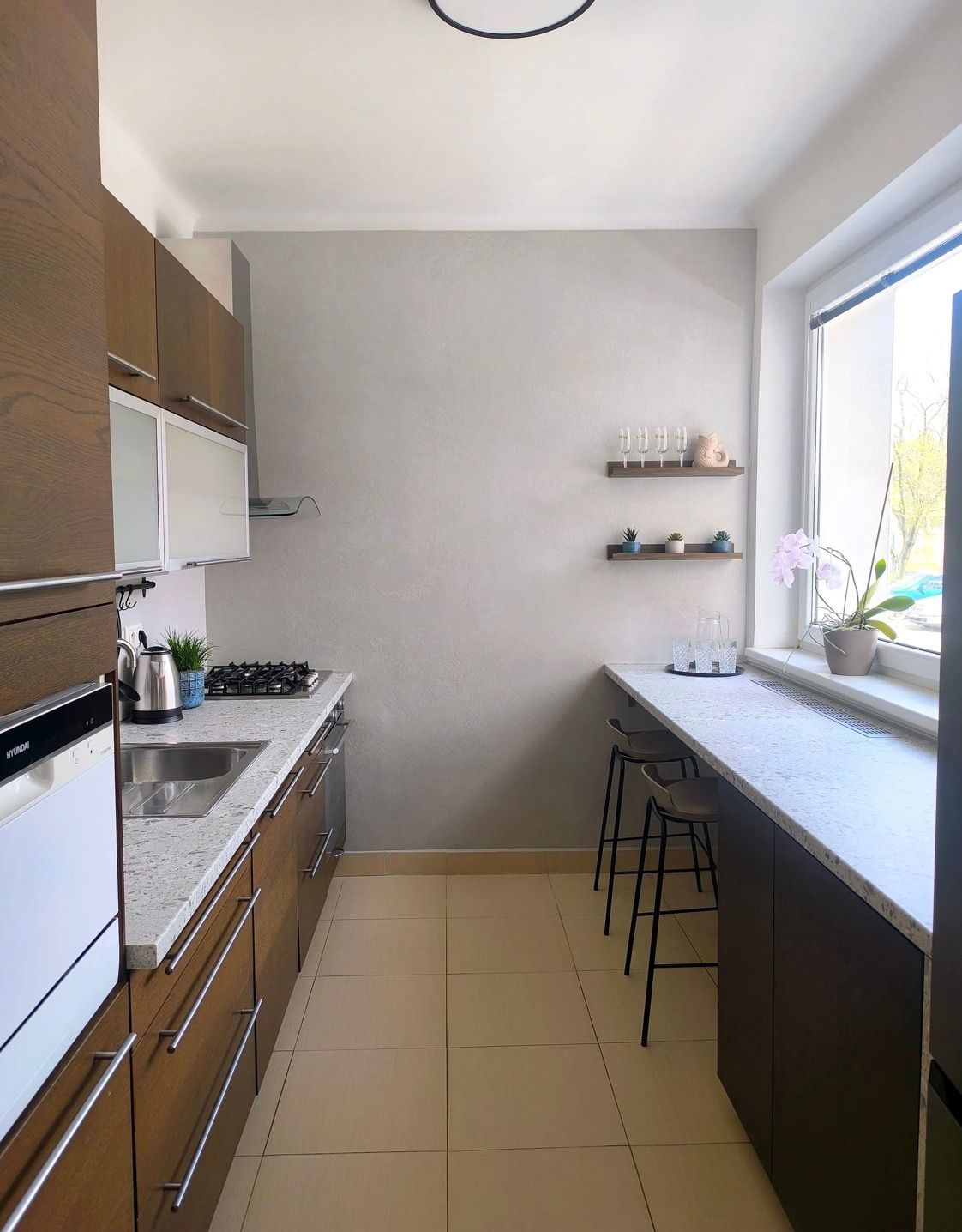 Kuchyňa je vybavená všetkými spotrebičmi- chladnička s mrazničkou, plynová varná doska, el. rúra, malá umývačka riadu, mikrovlnka aj rýchlovarná konvica.