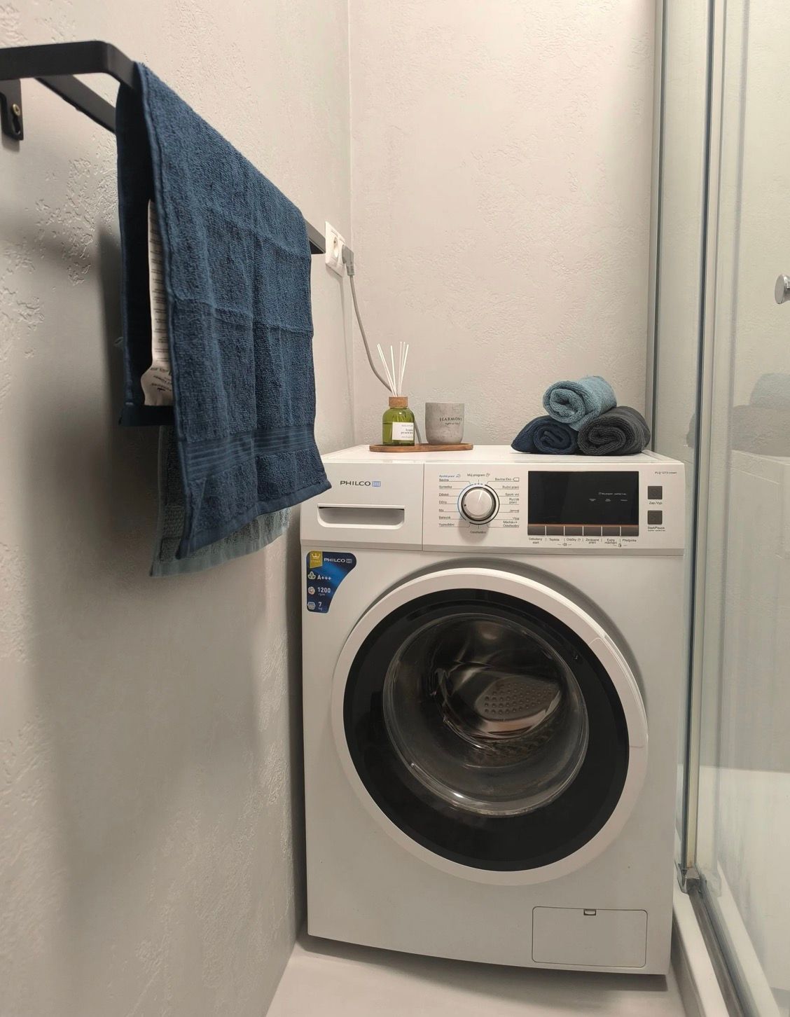 Kúpeľňa je vybavená sprchovým kútom, nábytkovou zostavou s umývadlom a práčkou.